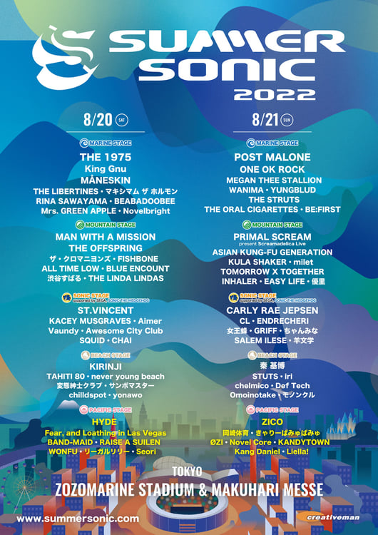 8月20、21日に開催される音楽フェスティバル「SUMMER SONIC 2022」千葉・ZOZOマリンスタジアム&幕張メッセ公演の追加出演者が発表された。
