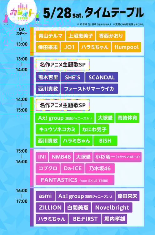 「カミオト-上方音祭-」はアーティストによるパフォーマンスはもちろん、トーク、お笑い、アニメ主題歌特集などさまざまな企画を届ける大型音楽特番。オンエア開始から13:00までにJO1、flumpoolらが出演し、13:00から15:00まではアニメ主題歌特集が展開される。15:00から16:00はINI、乃木坂46ら、16:00から17:00はAぇ! group、BE:FIRSTらがパフォーマンスを披露する。