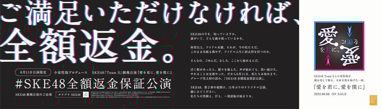本公演のリニューアルに伴い、公演に対する自信と覚悟、さらに本気度を示すためのアクションとして6月11日に「#SKE48全額返金保証公演」が開催されることが決定。この公演は「ご満足いただけなければ、全額返金」というチケット代の返金保証付きとなっている。返金保証付きの公演が行われるのはSKE48グループで初めてのことだ。