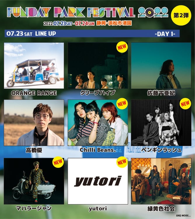 2021年8月に“すべての音楽ファンがさまざなジャンルの音楽と出会い、楽しめるイベント”として愛知・愛・地球博記念公園(モリコロパーク)で初開催された「FUNDAY PARK FESTIVAL」。今年は舞台を浜松市渚園に移して実施される。今回新たに追加されたのは、23日に出演するクリープハイプ、Chilli Beans.、ペンギンラッシュ、マハラージャン、yutori、24日に出演するOchunism、KREVA、ザ・クロマニヨンズ、Newspeak、Half time Oldの10組。これですでに出演が発表されていたORANGE RANGE、佐藤千亜妃、高橋優、緑黄色社会、岡崎体育、ゲスの極み乙女。、SUPER BEAVER、DADARAYを含む計18組がラインナップされた。