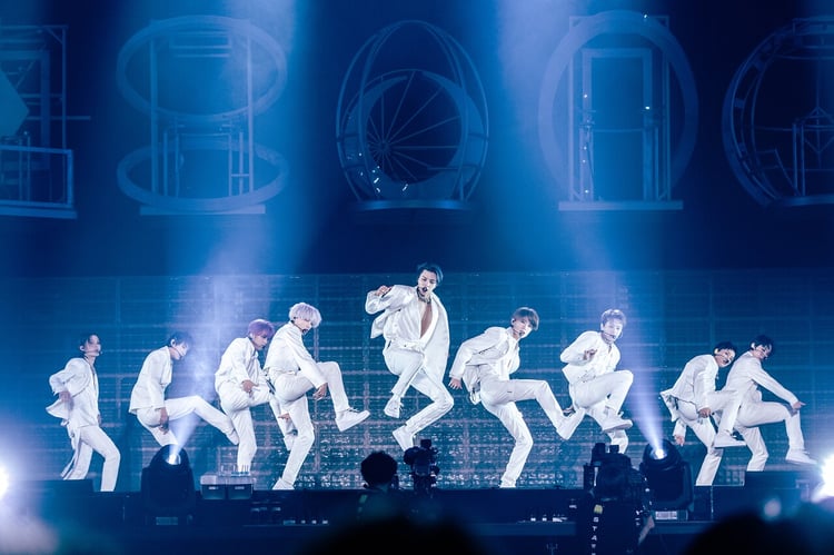 NCT 127がシズニを夢の中へと誘うオープニング映像を経て、巨大なLEDモニタが左右に開くと、オールホワイトの衣装に身を包み、異なるフォルムのゴンドラに乗った9人が登場。昇降するゴンドラの中のメンバーを1人ひとりカメラが捉え、表情がモニターに映し出されると、シズニたちの歓声が思わずこぼれる。京セラドームいっぱいに銅鑼の音が鳴り響き、NCTのイメージカラーである黄緑色だったペンライトが真っ赤に染まったのを合図に、9人はゴンドラからメインステージへと降り立った。ステージを挟む巨大モニターに「英雄」の文字が浮かび上がり始まったのは「英雄; Kick It」。NCT 127の楽曲タイトルがちりばめられたネオンの街並みの映像をバックに、9人はエネルギッシュにパフォーマンスし、満員のシズニを歓迎した。