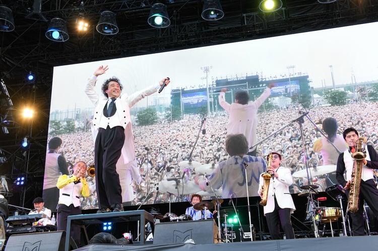 スカパラとムロは、「銀河と迷路」も披露。MCで「フェスはリハがないからどこまで動いていいかわからない」と不安を口にしていたとは思えないパフォーマンスで、ステージの端から端までを走り回った。曲のアウトロに乗せ、彼は「皆さん、毎日笑っていてください! 毎日楽しみましょう!」と何度もオーディエンスに訴え、楽曲はムロの大ジャンプで締めくくられる。ステージ袖にはけながら、ムロは「すごい人生経験でした! もう二度と立てることはないと思うけど、皆さんの顔が見られてよかったです。いつかまた会いましょう。そして、もう1回言わせてください! カッコいいよ、東京スカパラダイスオーケストラ!」と叫び、サプライズパフォーマンスを終えた。