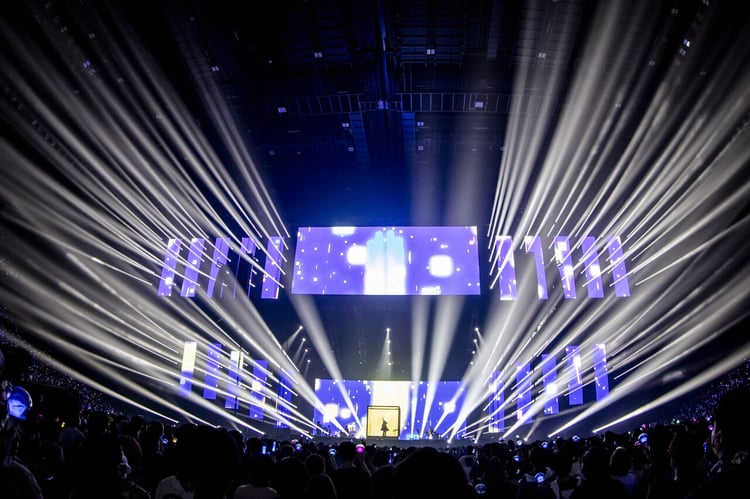多くの観客たちはドレスコードであるバラのアイテムを身に着け、開演の瞬間を今か今かと待ち構える。定刻を少し過ぎた頃に場内が暗転し、ブルーのライトが客席の四方八方を照らし始めた。一輪のバラをモチーフにした神秘的なオープニング映像が終わると、スケルトンのボックスに入ったAdoが登場。エレクトロなダンスナンバー「夜のピエロ」でライブの幕を開け、気怠げなムードの「ラッキー・ブルート」、ジャズテイストの「ラブカ?」と柊キライが手がける2曲を歌い踊り、オーディエンスを興奮の渦に巻き込んだ。
