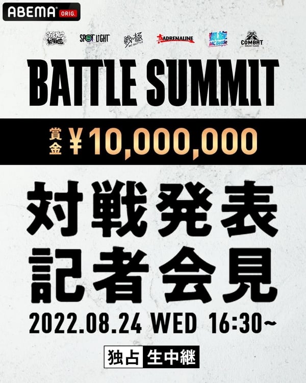 MCバトルイベント「BATTLE SUMMIT」の対戦発表記者会見が8月24日に行われる。この会見の模様がABEMAで生中継されることが決定した。