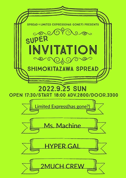 「SUPER INVITATION」はSPREADとLimited Express (has gone?)の共催で行われる企画。“もっともカッコいいパンクバンドを集める”をコンセプトに掲げたイベントで、Limited Express (has gone?)、Ms.Machine、HYPER GAL、2MUCH CREWの4組が出演する。チケットはLivePocketにて販売中。