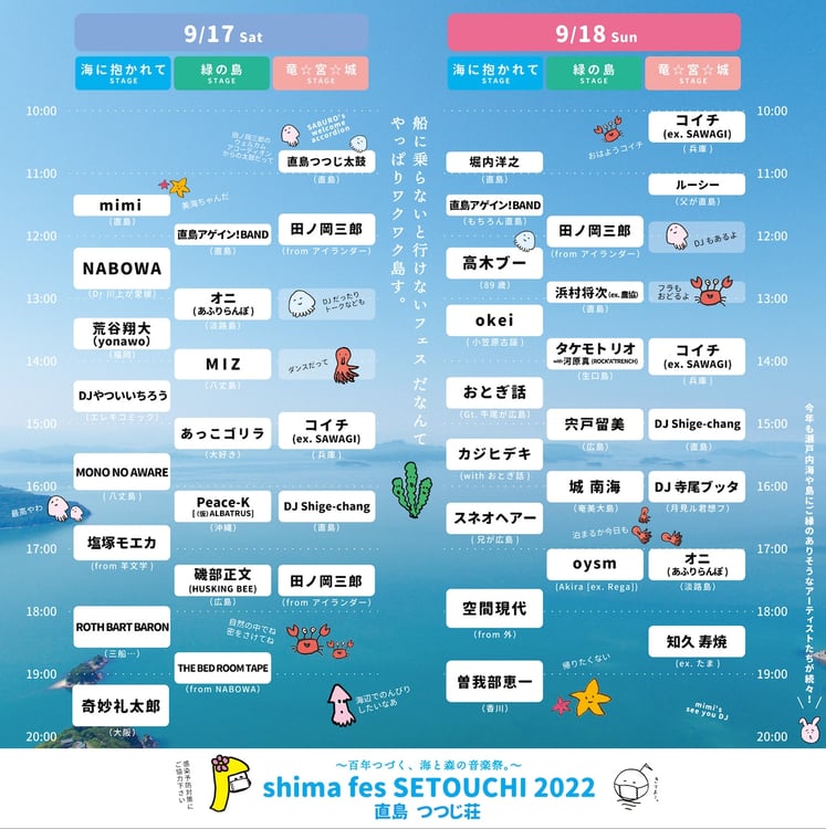 奇妙礼太郎 / ROTH BART BARON / 塩塚モエカ / MONO NO AWARE / MIZ / NABOWA / 荒谷翔大(yonawo) / 磯部正文(HUSKING BEE) / THE BED ROOM TAPE / DJやついいちろう / あっこゴリラ / Peace-K [(仮)ALBATRUS] / オニ(あふりらんぽ) / mimi / コイチ(ex. Sawagi) / 田ノ岡三郎 / 直島アゲイン!BAND / 直島つつじ太鼓