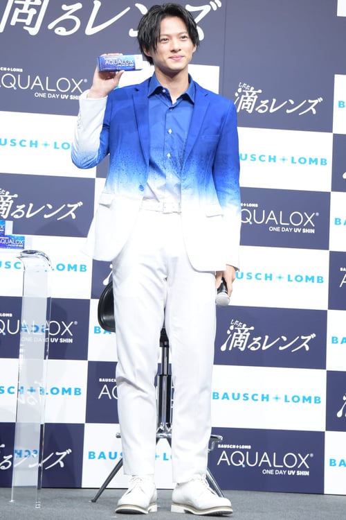 平野は「ボシュロム アクアロックス ワンデー UV シン」のキャッチコピー“滴るレンズ”の世界観をイメージした、ブルーのグラデーションのジャケットと白いパンツで登場。記者陣の前で2回ターンして、その衣装をじっくり披露する。さらに、ヘアスタイルにもこだわったようで「ウェットなスタイリング剤でセットさせていただきました」とアピールした。