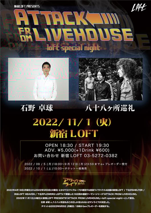この公演は4~5月にロフトグループが運営するライブハウス4店舗で行われた16日間連続のツーマンライブシリーズ「ATTACK FROM LIVEHOUSE」の番外編にあたるもの。イープラスでは9月12日までチケットのプレオーダーを受け付けている。