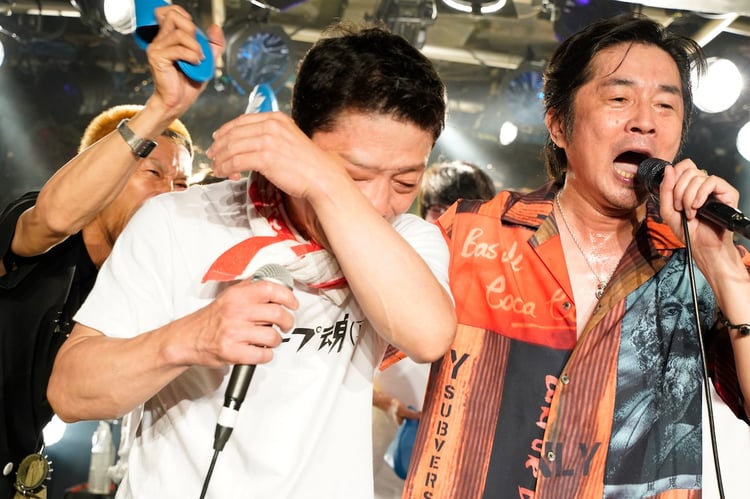 ライブ中盤で披露された「痛風だけど恋愛したい」では「この曲で泣いた人が勝ち」という謎のルールが生まれ、メンバーが真面目にそれぞれのパートを熱唱するひと幕も。しかし、すぐ泣くことで有名な石鹸はおろか誰一人として涙を流さず、わずか数分でルールは反故にされてしまう。そうこうしているうちに今度は「三宅ロックフェスティバル」の初回にも登場したニューロティカのアツシ(Vo)がひょっこり現れ、「I was PUNK!!~グループ魂にあっちゃん(NEW ROTE'KA)は?~」でグループ魂とコラボ。抜群のパフォーマンスとコンビネーションで、グループ魂との絆の深さを証明した。アツシがニューロティカの楽曲「ア・イ・キ・タ」を歌い切ったあとに勢いよく始まったのは「押忍!てまん部」。演者も観客もインパクトのある振付を一斉に踊り、奇妙な一体感をフロアに作り出す。なお、1月の再結成ライブでは3曲目で号泣していた石鹸だったが、この日はラストナンバーの「グループ魂のテーマ」まで笑顔を崩すことなくドラムを叩き続けていた。