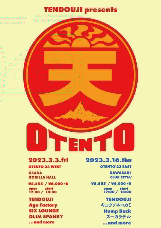 「OTENTO'23」は3月3日に大阪・GORILLA HALL OSAKA、16日に神奈川・CLUB CITTA'にて行われるTENDOUJI初の音楽フェス。出演者第3弾として神奈川公演にズーカラデル、大阪公演にTENDOUJIとは初対バンとなるGLIM SPANKYの参加がアナウンスされた。