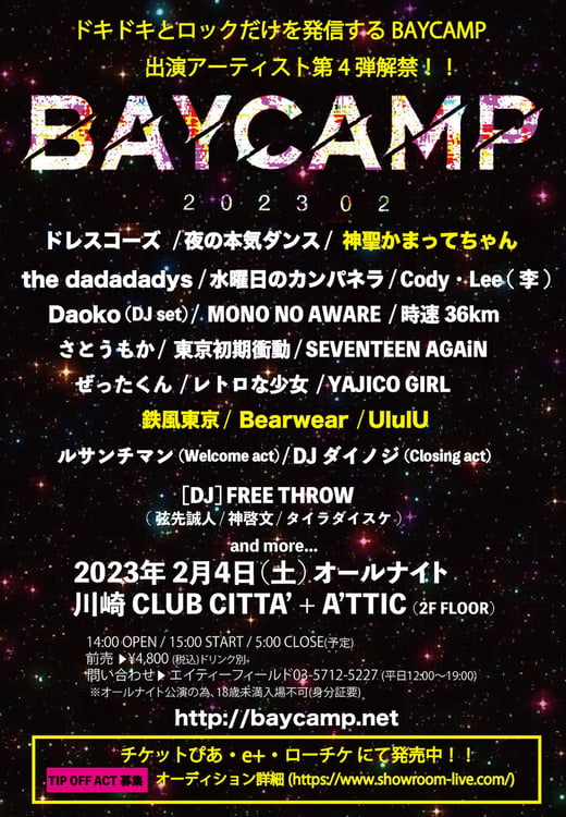 2月4日に神奈川・CLUB CITTA'で開催されるオールナイトイベント「BAYCAMP 202302」の第4弾出演アーティストが発表された。