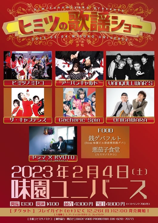 「味園ユニバース ヒミツの歌謡ショー」は、ヒミツノミヤコの活動開始10周年を記念して行われるイベント。ヒミツノミヤコのほか、アーバンギャルド、ザ・キャプテンズ、VANQULLWAR’S、Gacharic Spin、ONIGAWARA、そしてモーモールルギャバンのゲイリー・ビッチェ(Dr, Vo)によるバンド編成・ヤジマX KYOTOが出演する。