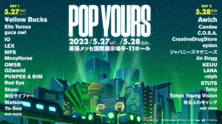 「POP YOURS」は「2020年代のポップカルチャーとしてのヒップホップ」をテーマとして昨年初開催された国内最大規模のヒップホップフェスティバル。今年の出演アーティスト第1弾としてLEX、OMSB、PUNPEE & BIM、梅田サイファー、Watson、CreativeDrugStore、ジャパニーズマゲニーズ、STUTS、Tohji、ゆるふわギャングら29組の出演が明らかとなり、¥ellow Bucksが初日公演、Awichが2日目公演のヘッドライナーを務めることが発表された。昨年のPUNPEE、BAD HOP同様に両日のヘッドライナーのステージには特別な演出が用意される。