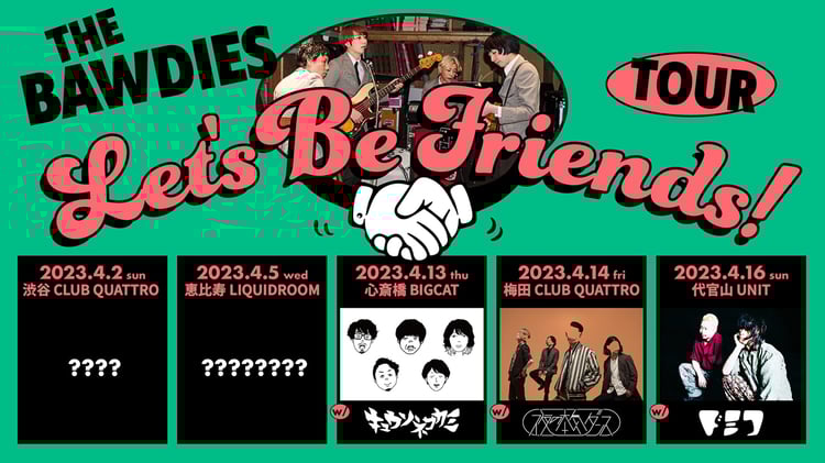 「LET'S BE FRIENDS! TOUR」はTHE BAWDIESが“仲良くなりたい! 初めましてのバンド”や“今まで相まみえたことはあるけど、今後もっと仲良くなりたい!バンド”を競演者に迎える企画。今回の発表では4月13日の大阪・BIGCAT公演にキュウソネコカミ、14日の大阪・梅田CLUB QUATTRO公演に夜の本気ダンス、16日の東京・UNIT公演にドミコが出演することが決まった。残り2公演の出演者は後日発表。チケットぴあでは2月19日23:59までチケットの先行予約を受け付けている。