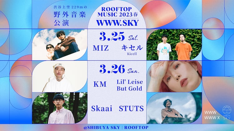 イベントの1日目にはMIZとキセル、2日目にはKM、Lil' Leise But Gold、Skaai、STUTSが出演。チケットの詳細はSHIBUYA SKYのオフィシャルサイトで確認を。