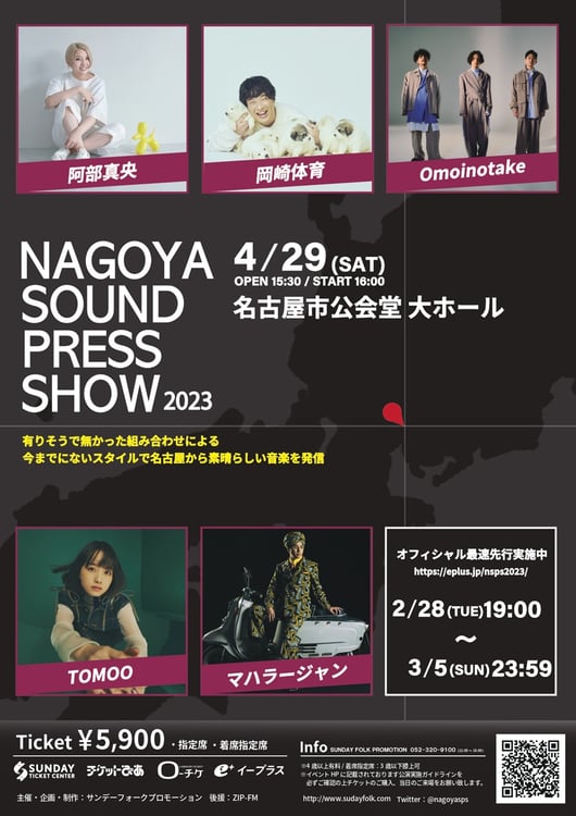 サンデーフォークプロモーション主催のもと、2020年1月に初開催された「NAGOYA SOUND PRESS SHOW」。3度目となる今回は阿部真央、岡崎体育、Omoinotake、TOMOO、マハラージャンの5組が出演する。イープラスでは3月5日23:59までチケットの先行予約を受け付けている。