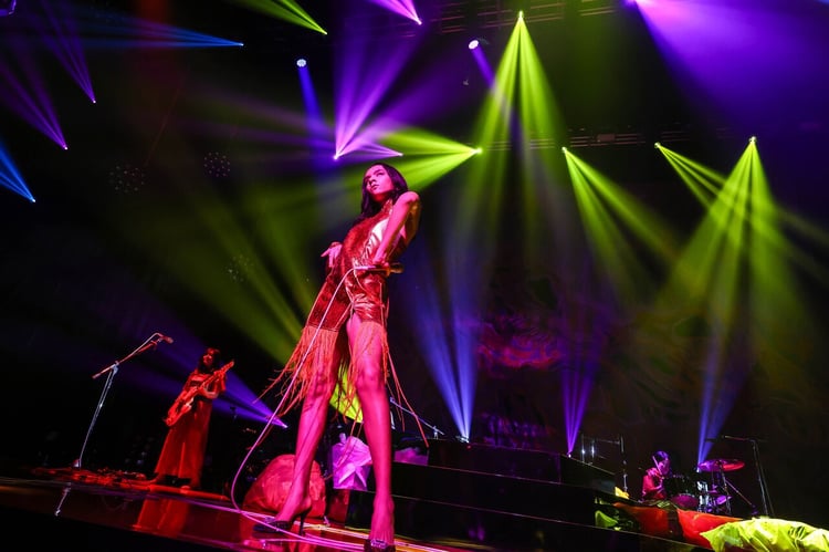1人きりでステージに残ったアヴちゃんは「十」をアカペラで歌い、会場内に荘厳な空気をもたらす。観客の視線を釘付けにするアヴちゃんと同じく赤い衣装に身を包んだメンバーが再びステージに現れ、それぞれの音を鳴らし始めると場内の張り詰めた空気がゆっくりと解けていった。そこからは再び強固なバンドサウンドによって、オーディエンスとの一体感が高まっていく。アルバムのタイトル曲「十二次元」では、アウトロのカウントをアヴちゃんが「11、12……13!」と1つ増やして叫び、「MYSTERIOUS」へとつなげる。「催眠術」でアヴちゃんが衣装のロングスカート部分を剥ぎ取り、ミニ丈にチェンジするとそのパフォーマンスはよりアグレッシブに。やしちゃんのパワフルなベースが炸裂した「デスコ」で、会場の狂乱状態はピークに達した。