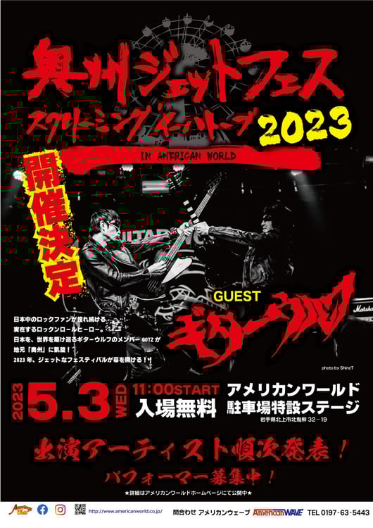 ギターウルフの主催ライブイベント「奥州ジェットフェス・スクリーミングイーハトーブ2023」が5月3日に岩手・アメリカンワールドにて開催される。