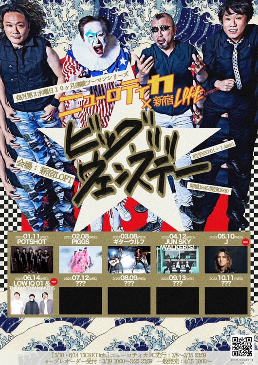 「ビッグ・ウェンズデー」は、“楽しみが週末だけではもったいない”と、10カ月連続で毎月第2水曜日に開催されるツーマンシリーズ。第5回公演にはJ、第6回公演にはLOW IQ 01 & THE RHYTHM MAKERSがゲスト出演する。ニューロティカのファンクラブでは明日3月8日10:00に、イープラスでは3月19日10:00にチケットの先行抽選予約の受付をスタートする。