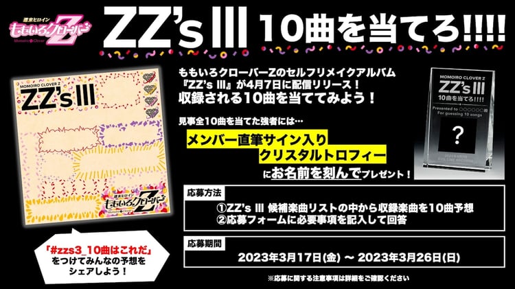「ZZ's III」は、現在のももクロメンバーの歌声で既発曲を再レコーディングする“セルフリメイクアルバム”の第3弾。配信リリースが決定したのに併せて、「『ZZ's III』10曲を当てろ!!!!」と題した企画の始動も発表された。この企画ではアルバムに収録される予定の全10曲が、どの曲になるのかという予想を募集。見事10曲とも当たった人の中から抽選で10名に、その応募者の名前を刻印した「メンバー直筆サイン入りクリスタルトロフィー」が贈呈される。さらに6曲以上当たった人にはオリジナルクリアファイルをプレゼント。応募フォームから回答を送信した人はもれなくメンバーからの“ねぎらい”コメントムービーを観ることができる。企画の始動に伴い、楽曲タイトルのロゴを消した状態のジャケットアートワークが公開されているので、応募を考えている人はこの画像を予想のヒントにしよう。
