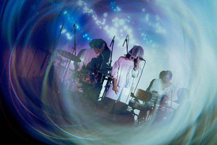 メジャーデビュー後初となるライブは、ameを中心に佐藤数馬(G)、ヤノアツシ(B)、河村亮(Dr)、成田祐一(Piano)といったメンバーによるバンド編成で行われた。白いベールで顔を隠したameは、「春めく花葬」の1曲目に収録された「最終解」をジャジーな演奏に乗せて艶っぽく歌い上げ、ライブの幕を開ける。「今日はメジャーデビュー後、初ライブということで、初めましての方が多いと思いますが、たくさんいろんな曲をお届けしますので、楽しんでいってください」と挨拶したのち、「傷を隠して」「ぜんぶ忘れてしまうって」といった最新作の収録曲を丁寧に歌い届けていった。また、「青に線香」「君のトーストになりたい」ではsobueによるオリジナル映像が初披露され、ポップなVJと、少し毒のある歌詞を歌うameの甘い声がひとつになり、まさにameの頭の中を覗いているような一体感のある空間を作り上げていた。