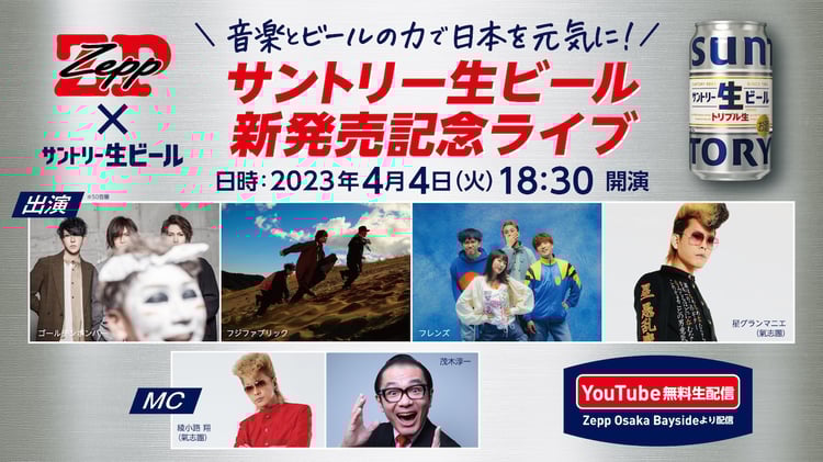 Zeppホールネットワークとサントリー株式会社は、新たに公式ドリンクパートナー契約を締結。4月4日に新発売されるサントリー生ビールが全国のZepp計8会場にて“Zepp公式ビール”に採用されるほか、連携企画が順次実施される。「音楽とビールの力で日本を元気に!サントリー生ビール新発売記念ライブ」もその一環で、大阪・Zepp Osaka Baysideより生配信ライブが届けられる。当日はMCとして綾小路翔(氣志團)と茂木淳一、ライブアクトとしてゴールデンボンバー、フジファブリック、フレンズ、星グランマニエ(氣志團)が出演する。