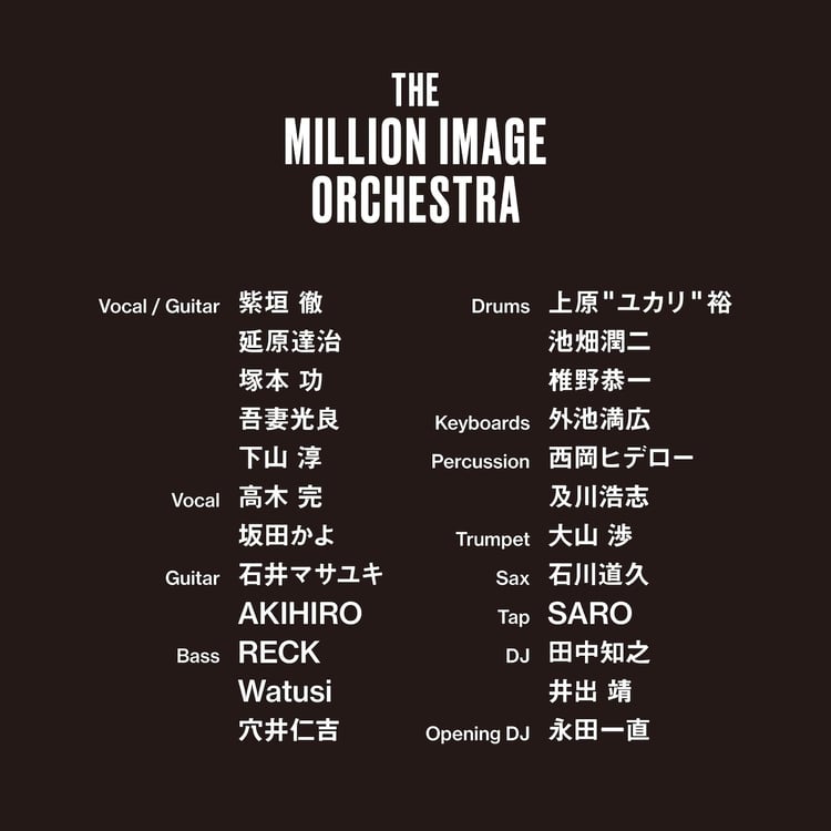 THE MILLION IMAGE ORCHESTRAがライブを行うのは2019年10月以来約3年8カ月ぶりのこと。出演メンバーは全24名で、ボーカルギターを紫垣徹(The Ska Flames)、延原達治(THE PRIVATES)、塚本功(SLY MONGOOSE)、吾妻光良、下山淳(ROCK'N'ROLL GYPSIES)、ボーカルを高木完と坂田かよ、ギターを石井マサユキ(TICA、GABBY & LOPEZ)とAKIHIRO、ベースをRECK(FRICTION)、Watusi(COLDFEET)、穴井仁吉(MOSQUITO SPIRALほか)、ドラムを上原“ユカリ”裕、池畑潤二(ROCK'N'ROLL GYPSIES、THE ROOSTERS)、椎野恭一、キーボードを外池満広、パーカッションを西岡ヒデローと及川浩志、トランペットを大山渉(BimBomBam楽団)、サックスを石川道久(The Ska Flames)が務める。さらにタップダンサーのSARO、DJとして田中知之(FPM)と井出がラインナップされている。また当日は永田一直がオープニングDJを務める。