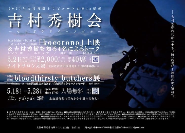 「吉村秀樹会」は吉村がこの世を去ってから10年という節目に行われる企画。5月21日にbloodthirsty butchersのドキュメンタリー映画「kocorono」上映会&トークがナイトサロン太陽で開催され、トークには映画の監督を務めた川口潤と、bloodthirsty butchersの射守矢雄(B)&小松正宏(Dr)、掟ポルシェという吉村を知る4名が登場する。予約は専用フォームにて受付中。またbloodthirsty butchersの関連作品や交友関係者からのメッセージからなる展示会が18日から28日までフリースペースyukyukにて入場無料で実施される。