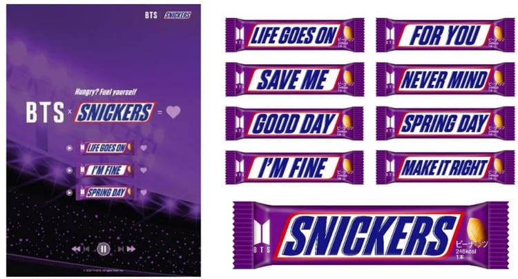 BTSとチョコレート菓子のスニッカーズとのコラボ製品「BTS スニッカーズ」が、明日4月11日より全国のスーパーやコンビニにて数量限定で販売される。