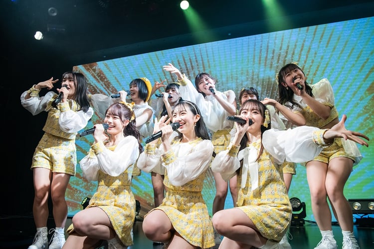 ラフり隊(ラフ×ラフファンの呼称)が9人の登場を待ちわびる中、場内にチャイムが鳴り響き、続いて「影ナレ選手権ー!」というメンバーの声が。ライブ開演前、出演者本人がライブにおける注意事項をアナウンスする演出はさまざまなアイドルの現場でも見られるが、そこはラフ×ラフ。「観客を不安にさせる影ナレ」という大喜利スタイルで影ナレを行い、開演前からラフり隊を楽しませた。オーディション開始から現在までの1年間の足跡をまとめたオープニング映像ののち、齋藤有紗、佐々木楓菜、高梨結、永松波留、夏目涼風、林未梨、日比野芽奈、藤崎未来、吉村萌南の9人は黒を基調としたデビュー曲「100億点」の衣装でステージへ。プロデューサー佐久間が過剰にフィーチャーされたミュージックビデオも話題の「100億点」を披露し、見応えのあるフォーメーションダンスでラフり隊の目を惹き付けた。9人が続けて歌い始めたのは、事前に一切の情報が出ていなかった新曲「ちょっと闇落ち」。THE SIGNALIGHTSのAkira SunsetとAPAZZIによるハードなダンスチューンで、作詞はオークラによるものだ。