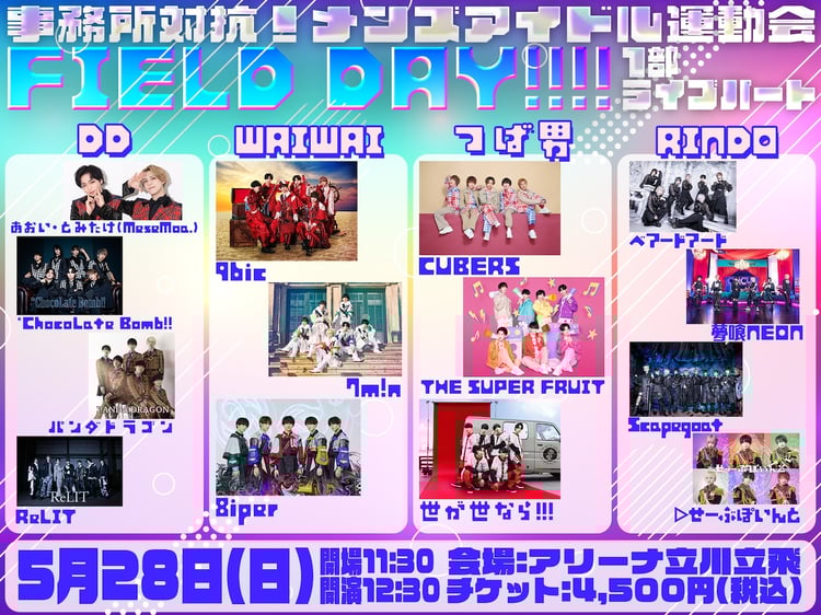 「FIELD DAY!!!!」には株式会社DDよりMeseMoa.のあおい、とみたけ、*Chocolate Bomb!!、パンダドラゴン、ReLITの4組、つばさ男子プロダクションからCUBERS、THE SUPER FRUIT、世が世なら!!!の3組、WAIWAI .incから9bic、7m!n、8iperの3組、RINDOよりベアードアード、夢喰NEON、Scapegoat、▷ せーぶぽいんとの4組が参加する。イベントは2部制で開催。1部は各グループによるライブが、2部には事務所対抗の運動会が行われる。イープラスでは4月23日23:59まで、イベントのチケット先行抽選予約を受付中。