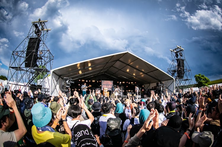5組によるアコースティックライブを経て、the band apartのワンマンライブがいよいよスタート。晴れていた空はいつの間にか曇天になり、時折涼しい風が吹き抜ける中、彼らは「higher」などを序盤に披露する。立て続けに楽曲を演奏し、イントロが流れるたびに歓喜の声が上がる盛り上がりを見せる中、「I love you Wasted Junks & Greens」では特に川崎亘一(G)のソロに会場が沸いた。