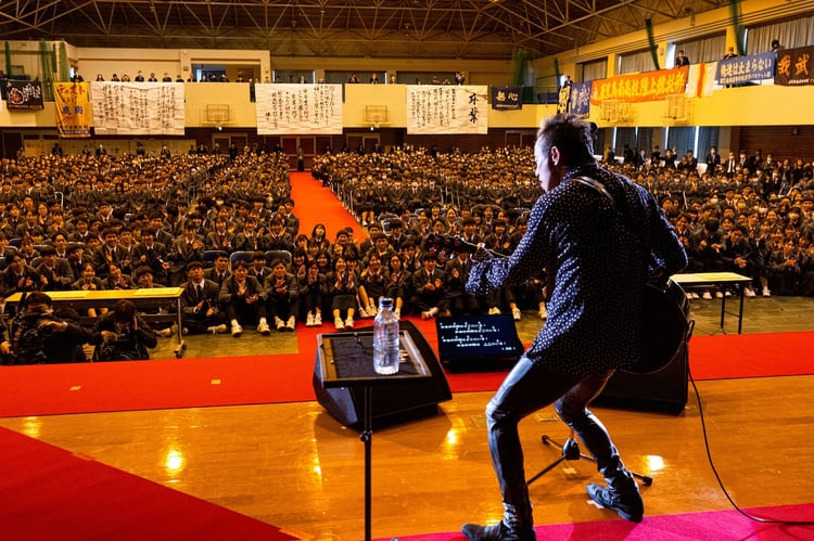 長渕はこのライブで、2009年に同校の生徒と制作した「卒業」や、卒業ソングとしても定番の「乾杯」など全8曲を披露。彼が卒業生へ贈ったメッセージに、思わず涙をこぼす生徒が続出した。ライブを終えた長渕は、後輩の姿を見て「みんなキラキラしていて、本当にかわいかった。あんな子たちと勉学に勤しみ、悩みを一緒に解決できる教師がうらやましい。もう1つ人生があるなら、教師になりたいね。なれないだろうけど(笑)」と思いを語った。