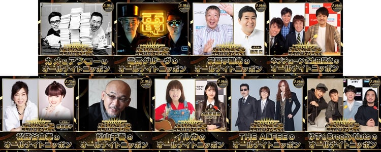 配信されているのは「カメ&アンコーのオールナイトニッポン」「電気グルーヴのオールナイトニッポン」「笑福亭鶴光のオールナイトニッポン」「ネプチューンと土田晃之のオールナイトニッポン」「松任谷由実のオールナイトニッポン」「松山千春のオールナイトニッポン」「イルカのオールナイトニッポン」「THE ALFEEのオールナイトニッポン」「ゆずとCreepy Nutsのオールナイトニッポン」の9番組。「オールナイトニッポンJAM」をダウンロードすれば誰でも聴くことができる。