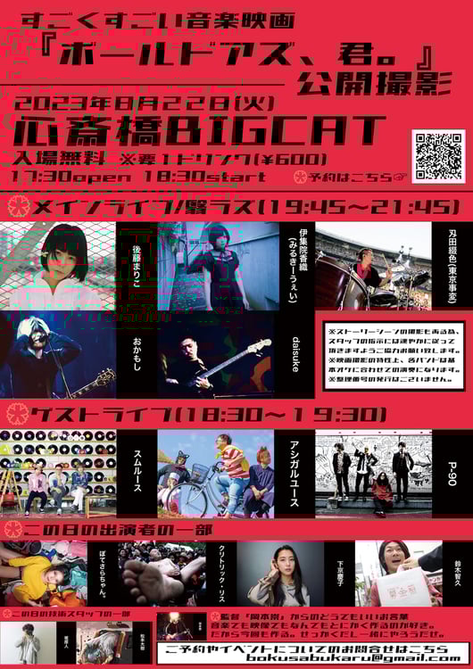 映画「ボールドアズ、君。」のライブシーンの公開撮影が8月22日に大阪・BIGCATで行われる。