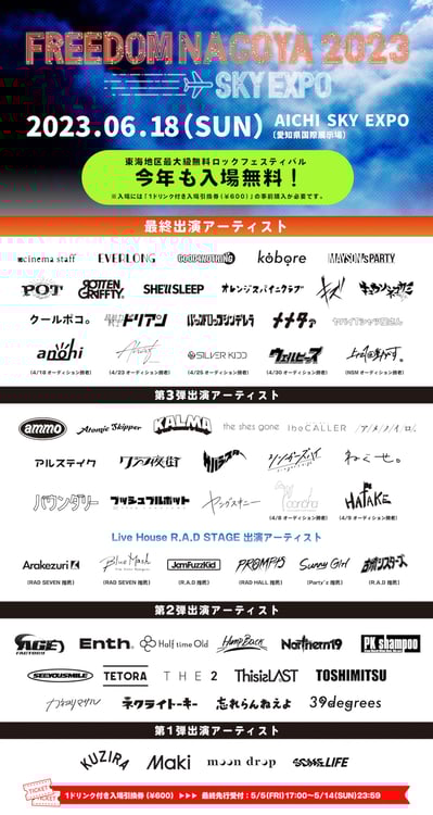 6月18日に愛知・Aichi Sky Expo(愛知県国際展示場)で開催されるロックフェスティバル「FREEDOM NAGOYA 2023 -EXPO-」の最終出演者が発表された。