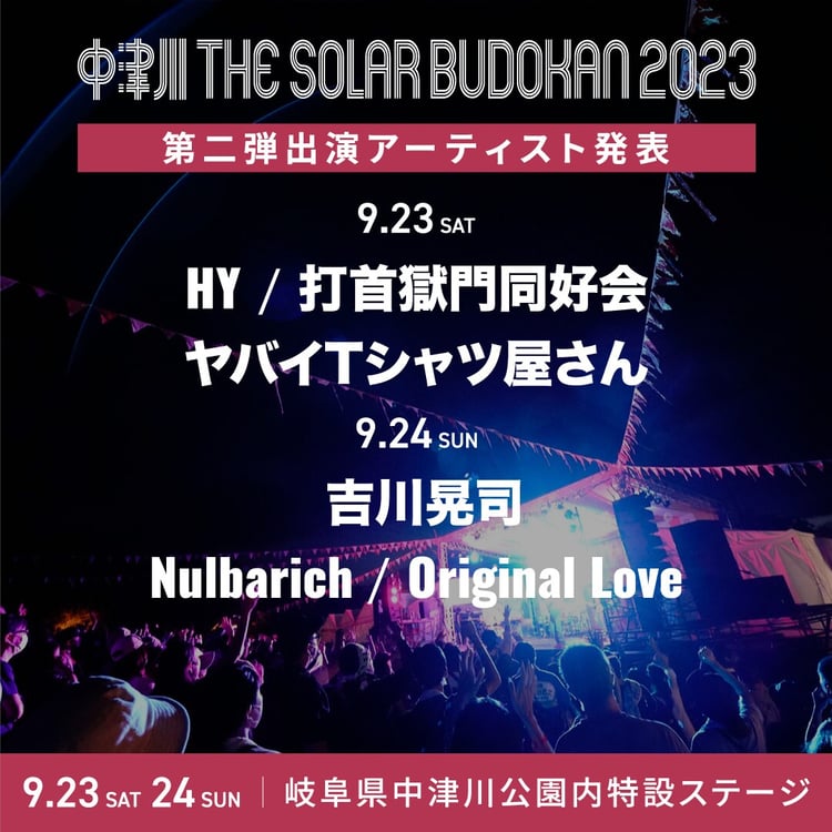 9月23日と24日に岐阜・中津川公園内特設ステージで開催されるロックフェス「中津川 THE SOLAR BUDOKAN 2023」の出演アーティスト第2弾が発表された。