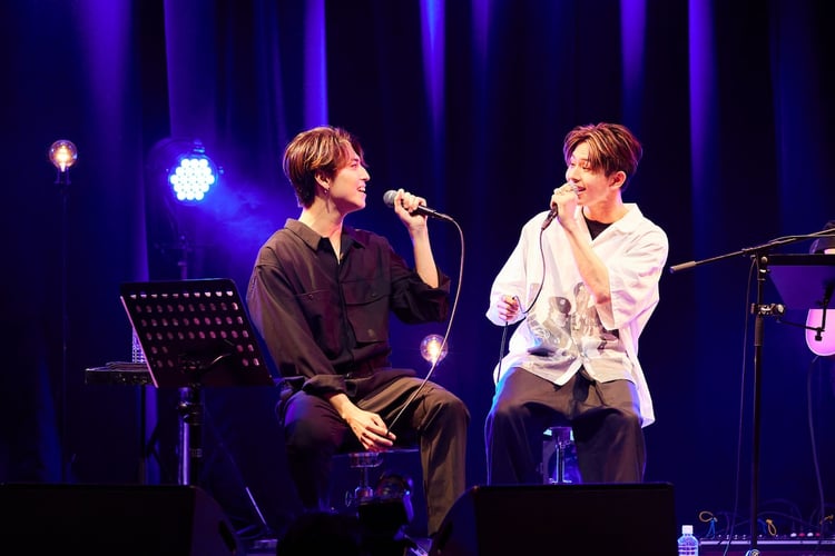 鳴り止まないアンコールの拍手に導かれてステージに戻った松尾は、「このイベントでしかできないことをやれたらいいなと思いまして」と告げ「おいで、EIKU!」とEIKUを迎え入れた。「面と向かって話したのって今日が始めてだよね?」と松尾が問いかけると、EIKUは「始めてです。もう光栄すぎて」と緊張の面持ちで返答。ぎこちなくも穏やかな2人のやりとりに、客席にも思わず笑顔が広がる。彼らがこの日の最後に届けたのはサザンオールスターズ「いとしのエリー」のカバーで、タカシがタイトルコールをすると、客席からはにわかに歓声が。隣同士で座ってお互いの顔を見合わせた松尾とEIKUは柔らかく美しいハーモニーでこのラブソングを歌い上げてライブを締めくくる。興奮渦巻くムードの中、松尾は「(ライブの)締めの相場はなんなの?(笑)」と悩みつつもEIKUとくまなく客席に挨拶し、最後まで手を振りながらステージをあとにした。