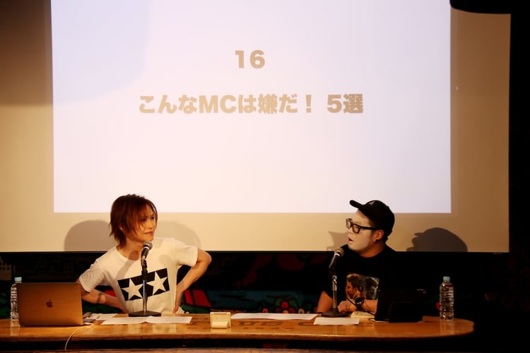 イベントの冒頭で団長は、「これはバンドマンが出されて困る本なんですよ! でも音楽のことは一切書かれてないんです! 1音も鳴ってない。いい意味で偏ってる」と鬼龍院の書籍を手に熱弁。一方の鬼龍院は「子供の頃から人の感情を気にしすぎていたので、それが本になった」と自身の性格が執筆のきっかけとなったことを明かす。そこから、書籍の目次をもとに話を展開していく2人。「音楽への幻想を捨てましょう」というテーマで話をしている際に団長は「俺は顔ファンが欲しい! 性的な目で見られたかった!」と願望を爆発させ、鬼龍院は「顔ファンに見られたくないという方もいますが、もうみんな自分が好きな愛し方で推せばいんです」と自分らしい形でアーティストを応援してほしいとフォローする。「こんなMCは嫌だ! 5選」「対バンライブにおいて前のステージは観ておくべき」といったMCにまつわるテーマでは、自分たちの実体験や出会ってきたバンドマンたちとのエピソードを大放談。その中で団長は「ブスがヴィジュアル系で売れるためにはどうしたらいいのかが俺のテーマだった」「ハジけるブスはライブハウスにいてはいけない!」と自身のポリシーを力説し、鬼龍院はエンタテイナーとしてのレディー・ガガのすごさに言及しつつ「僕は音楽の天才じゃないから、自分ができることをやる」というスタンスであることを語った。