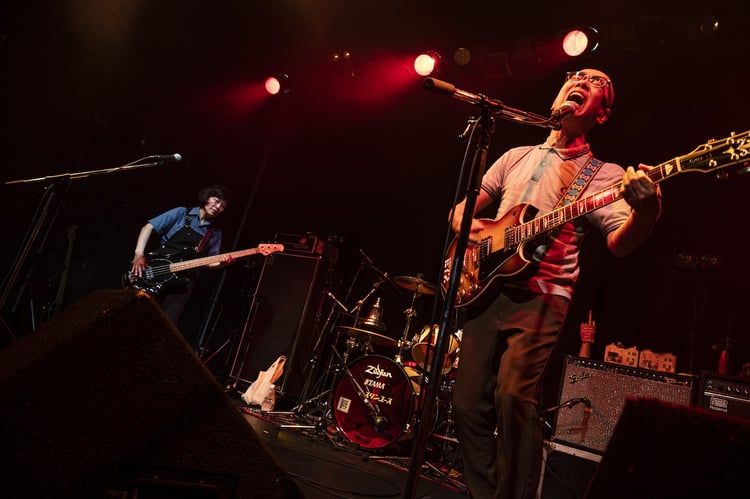 先攻を務めるサニーデイは姿を現すや否や「花咲くころ」を演奏。ゆったりとしたテンポながらも重厚感のあるサウンドでライブの幕開けを飾る。続けて初夏の訪れを感じさせるナンバー「江ノ島」が披露され、熱気で満ちた会場にさわやかな空気が呼び込まれる。曽我部が「憧れのバンドと対バンということで、昨日から寝られなかった。一睡もしてない……一睡もはウソだけど(笑)。本当に楽しみにしてました」と笑顔で語り、その後3人は疾走感あふれる「さよなら!街の恋人たち」からゆったりしたバラード「白い恋人」へと続け、緩急の利いたセットリストで観客を魅了した。