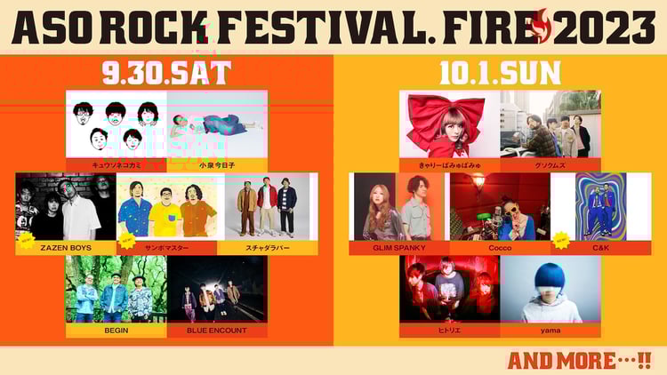 9月30日、10月1日に熊本・熊本県野外劇場アスペクタで行われる野外ロックフェス「ASO ROCK FESTIVAL FIRE 2023(阿蘇ロックフェスティバル FIRE 2023)」の出演アーティスト第3弾が発表された。