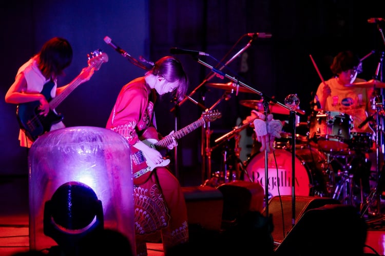 リーガルリリーは「ジョニー」でライブをスタートし、そのままなだれ込むように「たたかわないらいおん」へ。新曲「ハイキ」では軽やかなグルーヴが構築された。たかはしほのか(Vo, G)がエレキギターからアコースティックギターに持ち替えて演奏したのは「overture」。8曲目「教室のドアの向こう」の終わりまでMCを挟まずに、3人はひたすらに音をかき鳴らした。