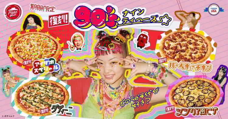 復刻ピザ「復刻アイダホスペシャル」「復刻シシリア風ピザ」「復刻ダディーニ」「復刻バーベキューチキン」を販売中のピザハット。このたびの新CMでは、詩羽がそれぞれの商品をイメージした90年代ファッション「アメカジスタイル」「ゼブラ柄ファッション」「デコラファッション」「パレオスタイル」で登場する。