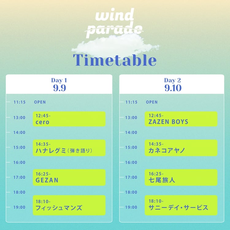 9月9、10日に埼玉・秩父ミューズパークで行われる野外音楽イベント「WIND PARADE '23」のタイムテーブルが発表された。9日公演のトリをフィッシュマンズ、10日公演のトリをサニーデイ・サービスが飾る。