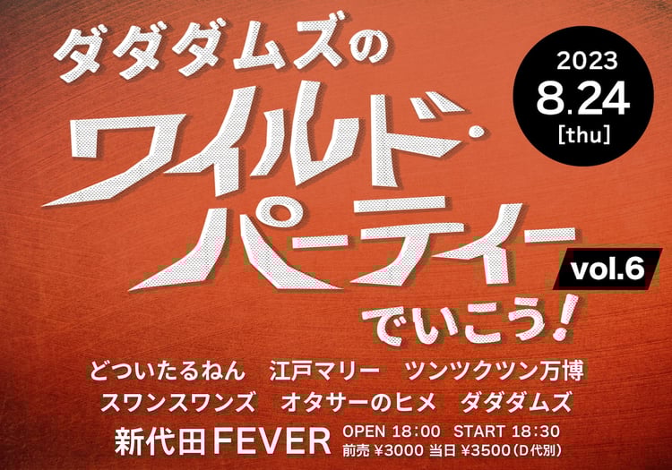 ダダダムズの主催ライブ「ダダダムズのワイルド・パーティーでいこう! vol.6」が8月24日に東京・新代田FEVERで開催される。