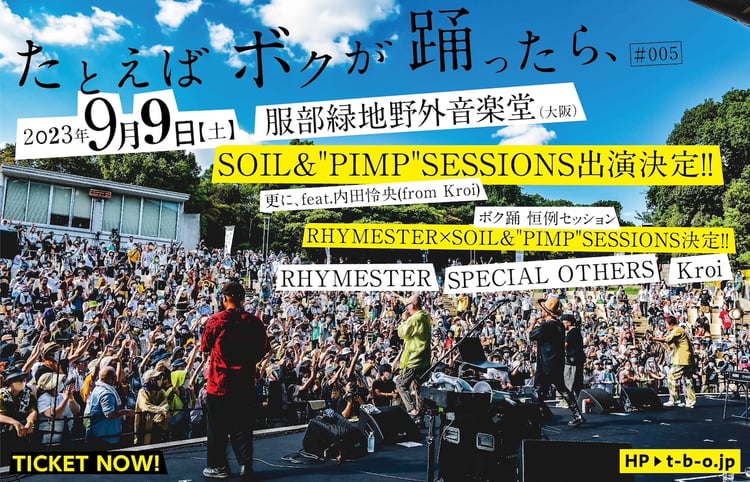 「たとえばボクが踊ったら、」は、「関西で魅力的なキモチいいフェスしたい」という思いから2016年にスタートしたライブイベント。今回はRHYMESTER、SOIL&"PIMP"SESSIONS、SPECIAL OTHERS、Kroiの4組が出演する。当日はイベント恒例のRHYMESTERとSOIL&"PIMP"SESSIONSによるプレミアセッションや、SOIL&"PIMP"SESSIONSとKroiの内田怜央(Vo)のコラボレーションも披露される。