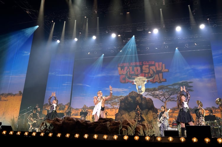 ファイナル公演当日、開演時刻を迎えて紗幕が上がり、アフリカのサバンナを模したステージで最初に奏でられたのは往年のテレビアニメ「ジャングル大帝」のエンディングテーマ「レオのうた」。ライオンを象った被り物を付けたカールスモーキー石井(Vo)を中心に、メンバーたちはアニマル柄の衣装で勇壮なアンサンブルを奏でて観客のテンションを高めた。「最後までよろしく!」という石井の挨拶に続いてはバンドを代表する大ヒット曲「浪漫飛行」そして「WE ARE MUSIC!」へ。草原を吹き抜ける風のように、軽やかなサウンドが届けられた。