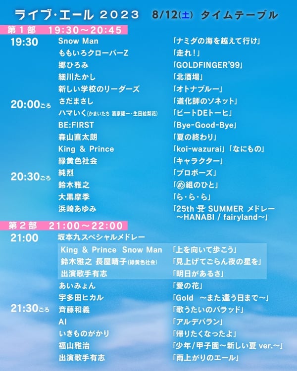 明日8月12日19:30よりNHK総合、NHK BS4K、NHK BS8Kで放送される音楽番組「ライブ・エール2023」のタイムテーブルが発表された。