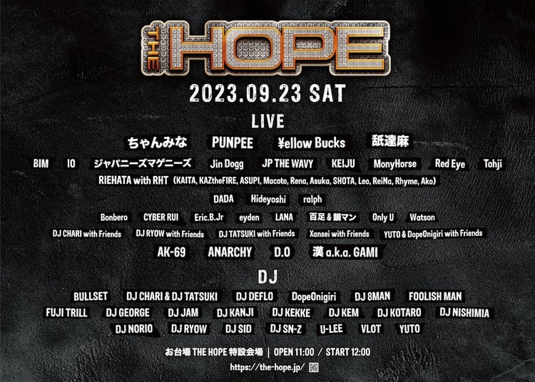 「THE HOPE」は昨年東京・国立代々木競技場第一体育館で初開催され、1万人を超える動員を記録したヒップホップイベント。舐達麻と合わせて、RIEHATAと彼女率いるダンスチームRIEHATATOKYO、プロデューサーのXanseiも出演も決定した。Xansei、DJ CHARI、DJ RYOW、DJ TATSUKI、YUTO & DopeOnigiriのステージには、後日発表となる豪華客演アーティストがそれぞれ登場する予定だ。