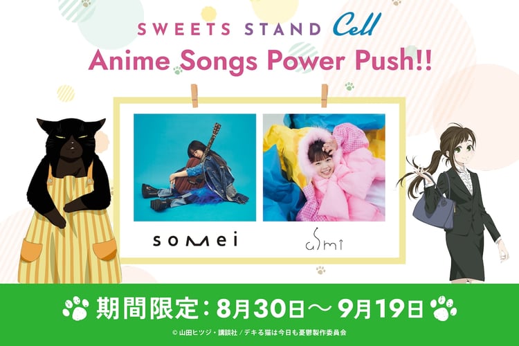 これはSWEETS STAND Cellとアーティストのコラボレーション企画「Anime Songs Power Push!!」第2弾として実施されるもの。期間中、店内では、someiが歌うアニメ「デキる猫は今日も憂鬱」のオープニングテーマ「憂う門には福来たる」とasmiが歌う同アニメのエンディングテーマ「破壊前夜のこと」がBGMとして流れるほか、someiとasmiの直筆サインが掲示され、店内のデジタルサイネージにはミュージックビデオが映し出される。
